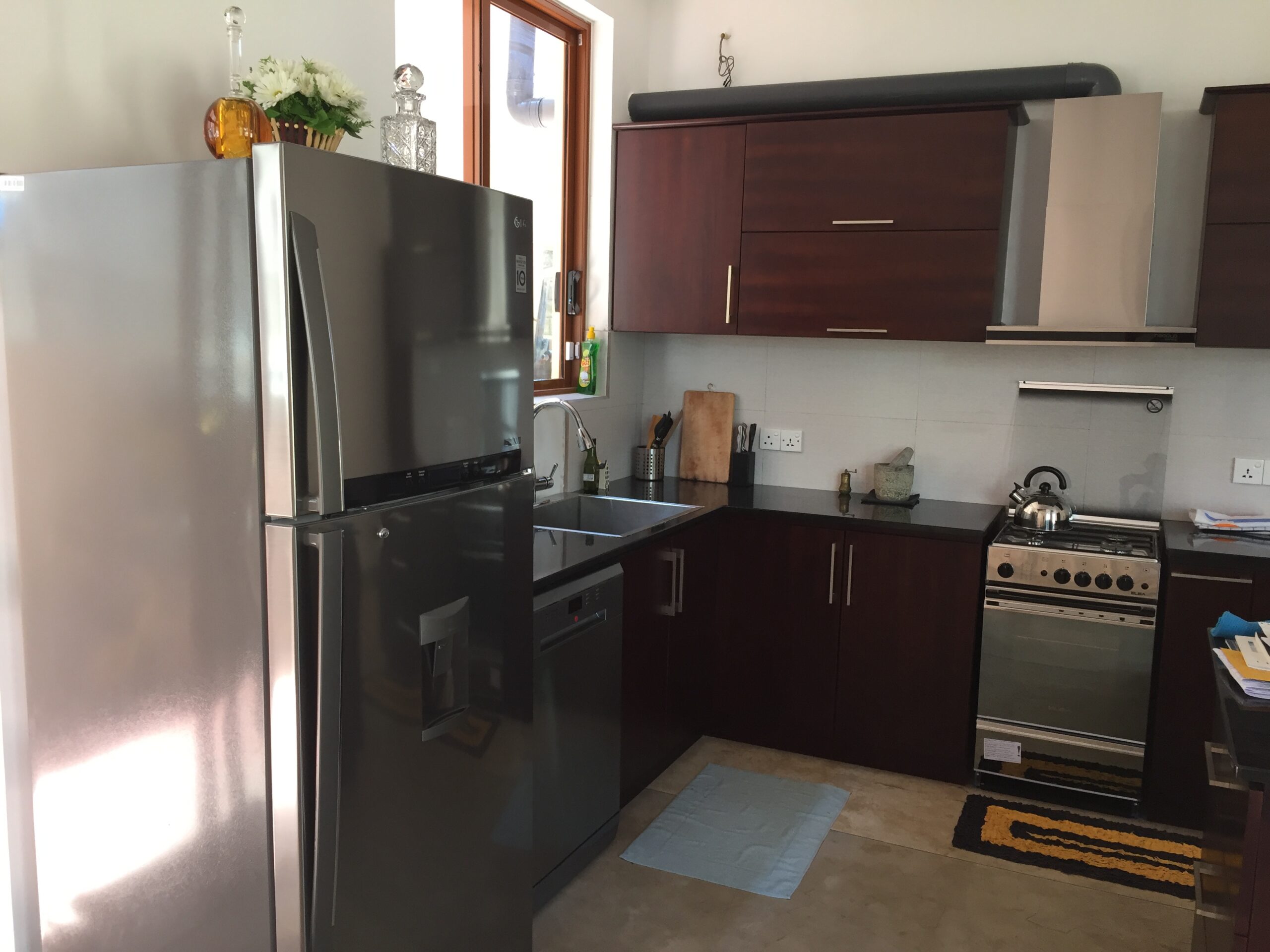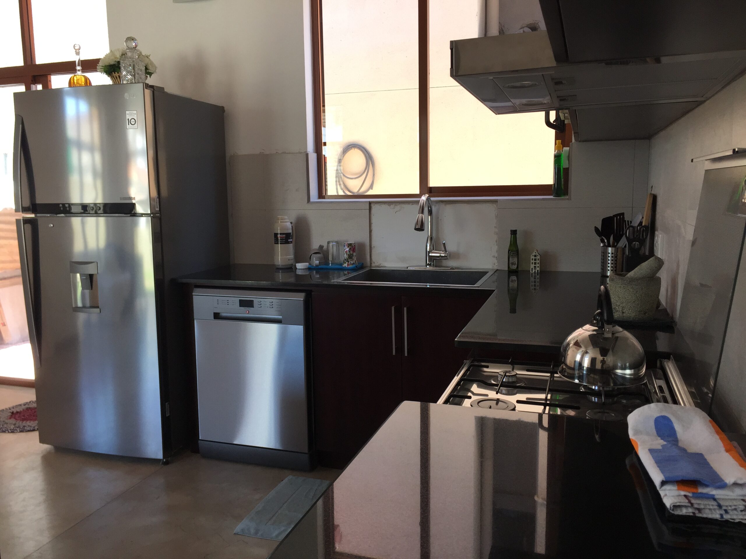 (7) Kitchen equipped with a large LG fridge with water dispenser, dishwasher, four-burner gas cooker, oven and fume-hood